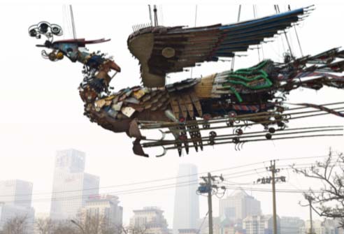 Xu Bing’s Phoenix is another extraordinary piece of the aestheticization of the effect of the post-1989 neoliberal and transnational capitalism in China. Phoenix, or Fenghuang, was commissioned by CBC (Beijing) in 2008 for the new Beijing World Financial Center. This work was composed of two huge metallic birds, 12 feet above the ground, 28-meter long and 6 tons each. Xu Bing returned to Bejing in 2008, 18 years after he left China in 1990, when the lingering atmosphere of the June 4th Event of 1989 in Beijing was too much an unspeakable tension for him. Xu Bing was stroke by the sight of the rapidly changed city and the harsh working conditions of migrant laborers in the city, a sharp contrast to the laborers in the socialist China in mid-twentieth century when he himself used to be a laborer and worked in rural villages. In his installation of these two gigantic birds, Xu Bing then assembled the rusted and wasted tools used by the workers at the construction sites. If we look closely, we could see objects such as tower crane hoists, rusted tire rims, steel saws and scoops, iron barrels, screwdrivers, hose tanks, girders, safety helmets, glass fragments and construction gadgets. These garbage-like objects were the necessary subsistence indispensible to the migrant laborers in their daily works and their daily lives. They became attached to these metallic tools, while they themselves also have turned out to be part of the objects consumed by the rapid developmental projects and easily disposable through the production process. The elegant but horrible gigantic figures of the mythological birds, symbolizing the rebirth of China in an ironic way, hang above the ground in the new business center and marked the alternation of the landscape of Beijing city.